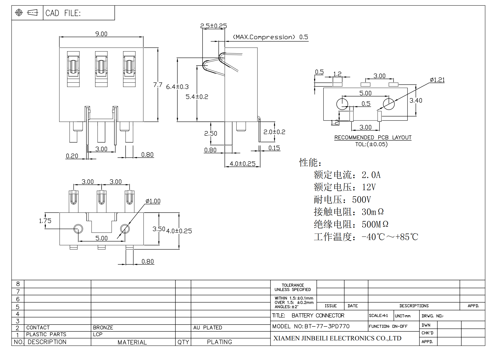 BT-77-3PD770 3.0mm Pitch Spring Battery Connector 3Way THT Hole Right Angle