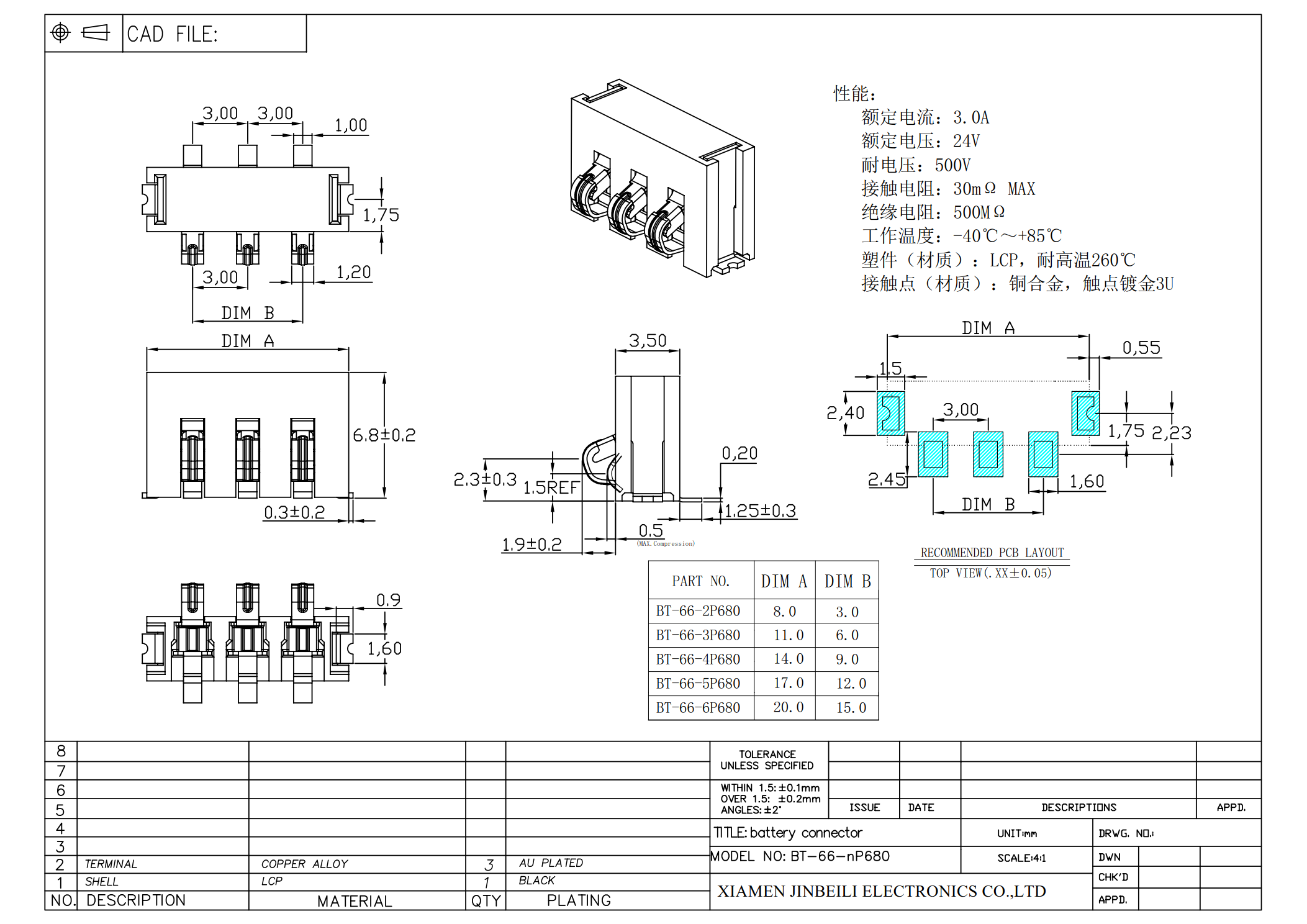 This spring battery connector offers a compact and reliable solution for battery-powered devices, featuring a 3.0mm pitch and a low-profile design with a contact height of just 2.3mm and low overall height ( insulation housing height ) of 6.8mm. Its right-angle surface-mount (SMT) configuration ensures easy PCB integration, making it ideal for space-sensitive applications such as wearables, medical devices, IoT gadgets, and portable electronics.