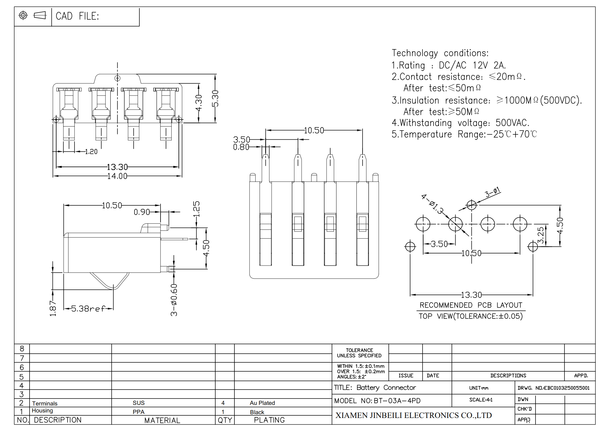 The spring loaded battery connector is a compact and reliable component designed for secure and efficient power connection. Featuring a 3.5mm pitch, this through-hole right angle type connector offers 4-way contacts, making it suitable for a variety of applications. The terminals are crafted from SUS material and plated with gold (Au) to enhance durability and extend the mechanism lifecycle.