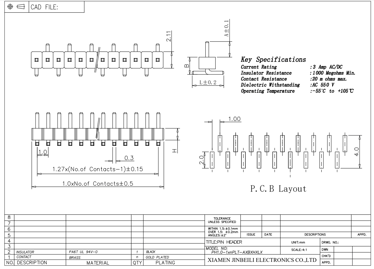 Custom Single Row Pin Header 1.0mm Pitch Surface Mount Vertical Board to Board Connector