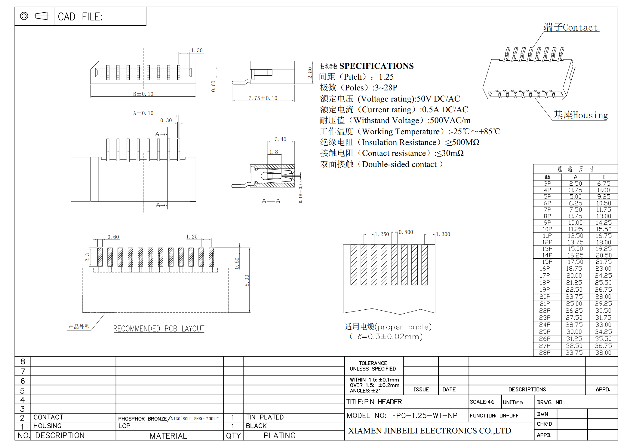 FPC-1.25-WT-nP 1.25mm Pitch FPC Connector Surface Mount Right Angle