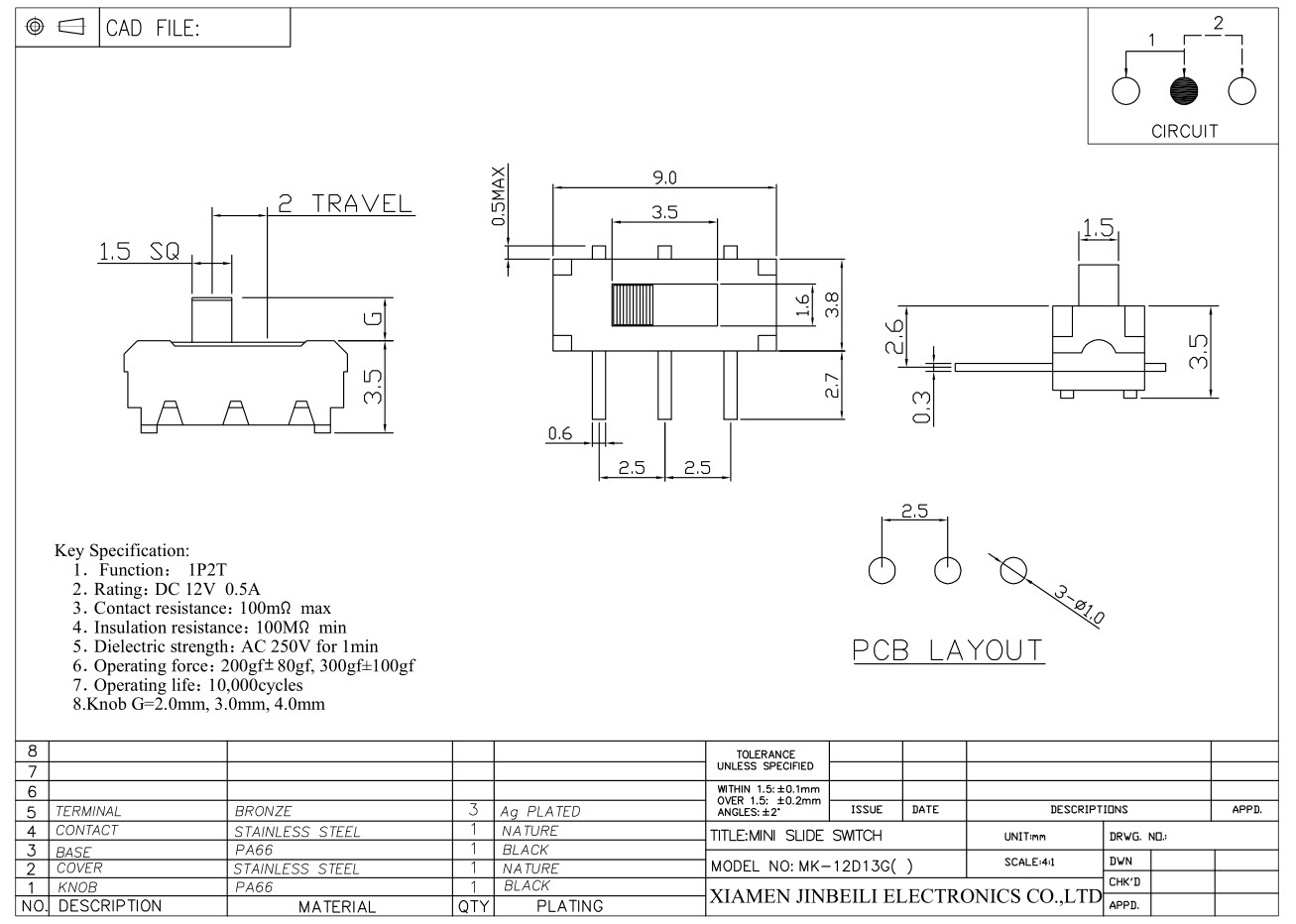MK-12D13 Miniature Slide Switch SPDT THT Hole Right Angle