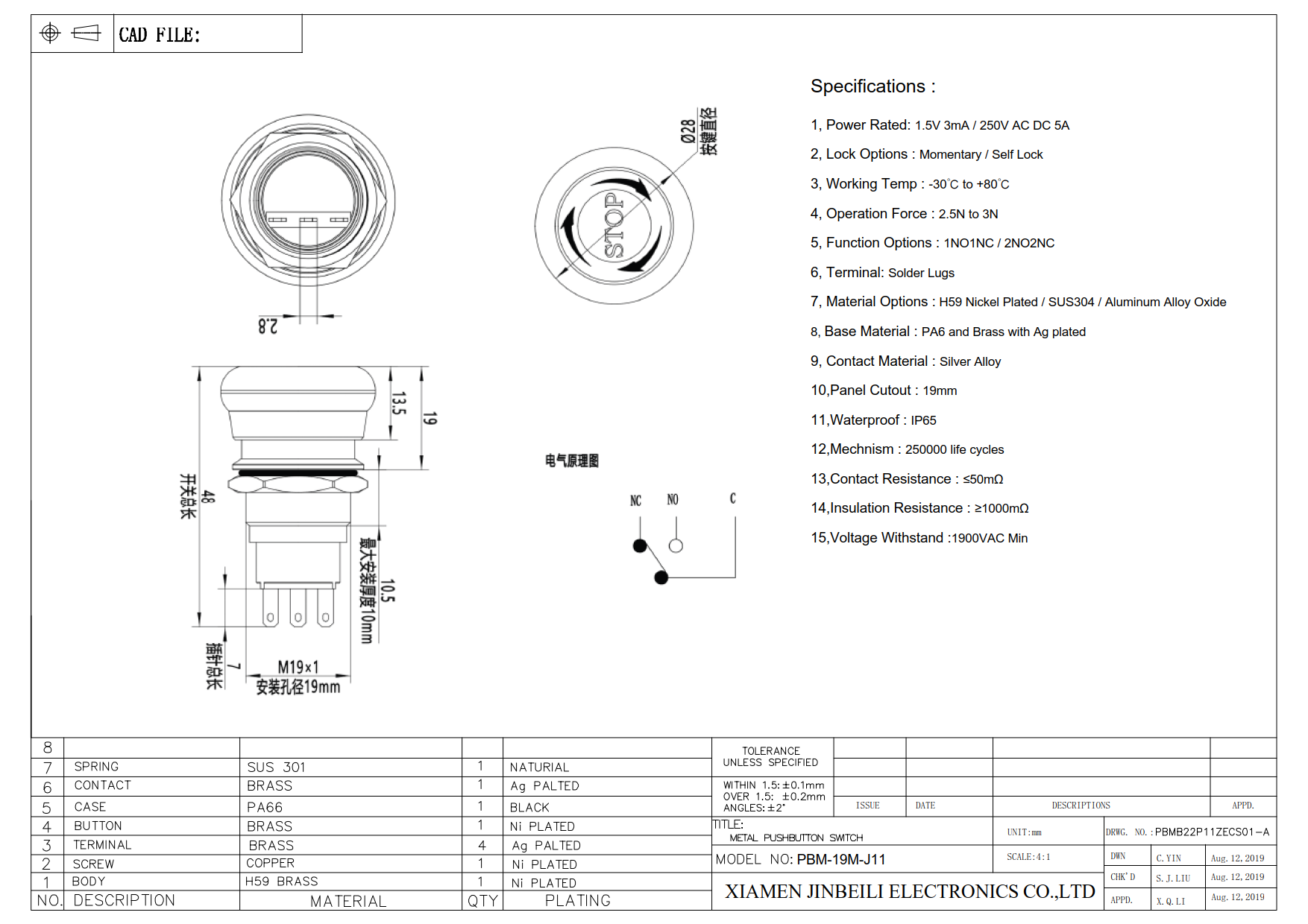 our 19mm Emergency Stop switch, designed for critical safety applications. With a panel cutout of 19mm, it seamlessly integrates into control panels. Featuring both Momentary and Latching options, it offers versatility in usage. Crafted from durable stainless steel or lightweight aluminum alloy, it ensures reliability in various environments. Equipped with 1NO (Normally Open) and 1NC (Normally Closed) contacts, it provides flexibility in circuit configurations. Rated for 250V and 5A, it guarantees reliable performance under demanding conditions. Ensure safety and control with our 19mm Emergency Stop switch.
