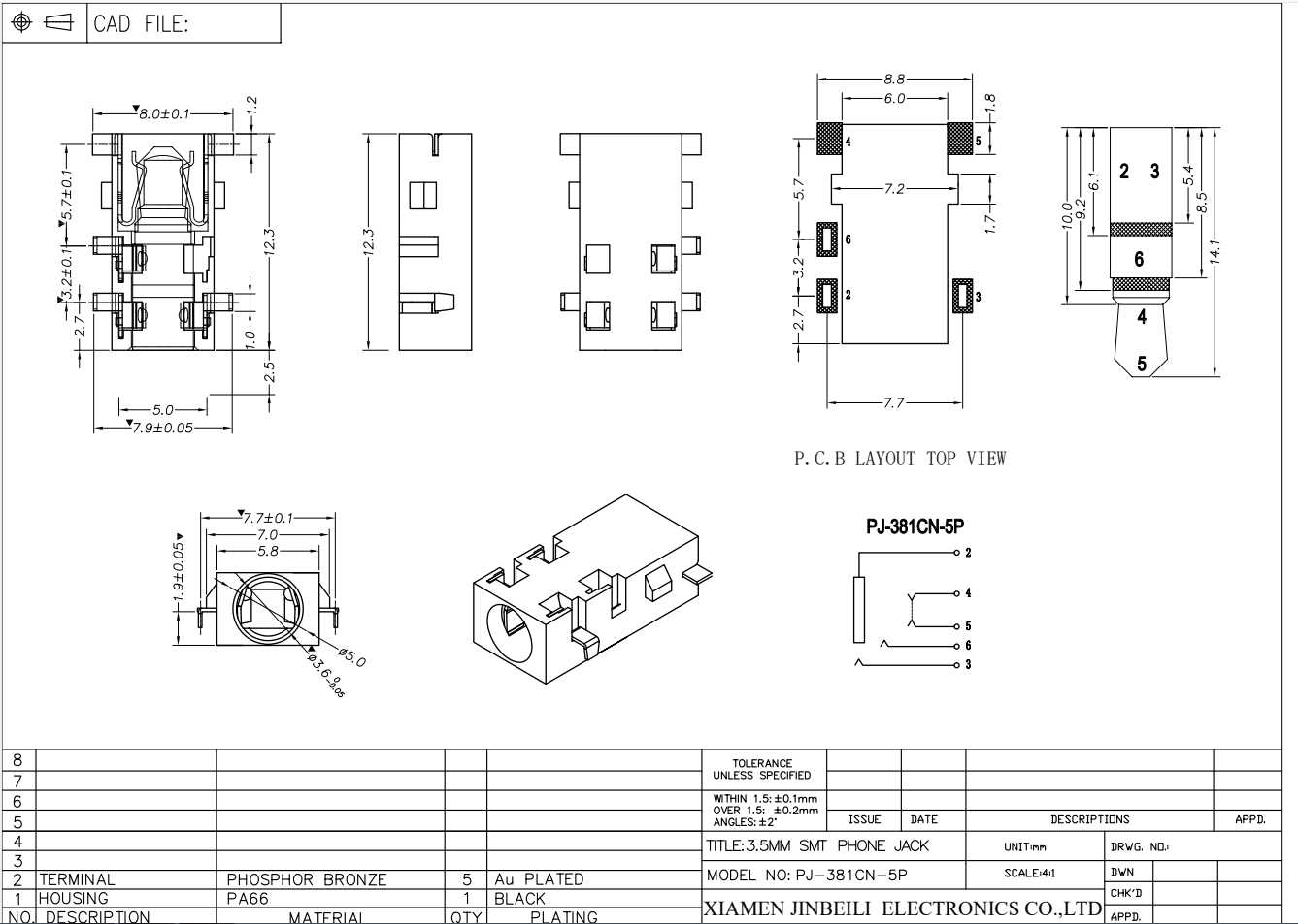 PJ-381CN Mid Mount 3.5mm Audio Jack SMT