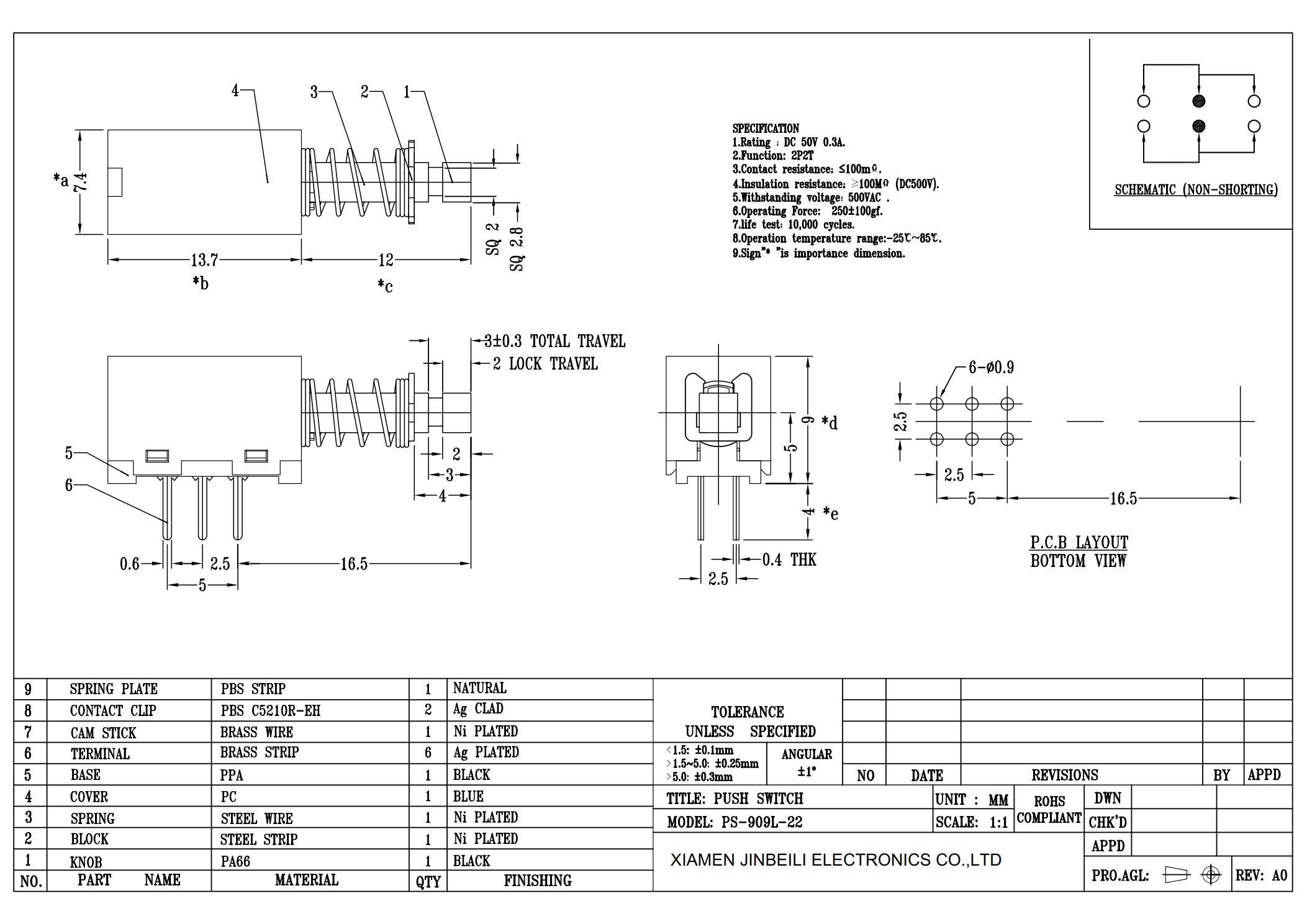 Key electrical specifications include a power rating of DC 50V at 0.3A, making it ideal for signal-level and low-current control circuits rather than high-power loads. Mechanical characteristics enhance usability: total travel is 3.0mm for a satisfying press feel, while lock travel in latching mode is 2.0mm for clear tactile feedback and reliable state changes.