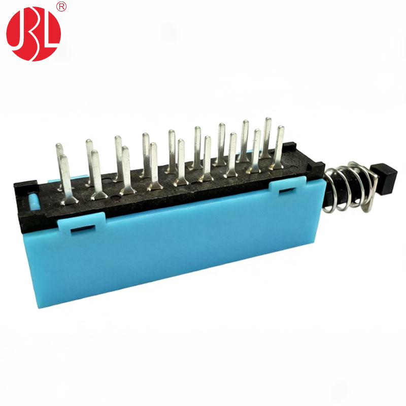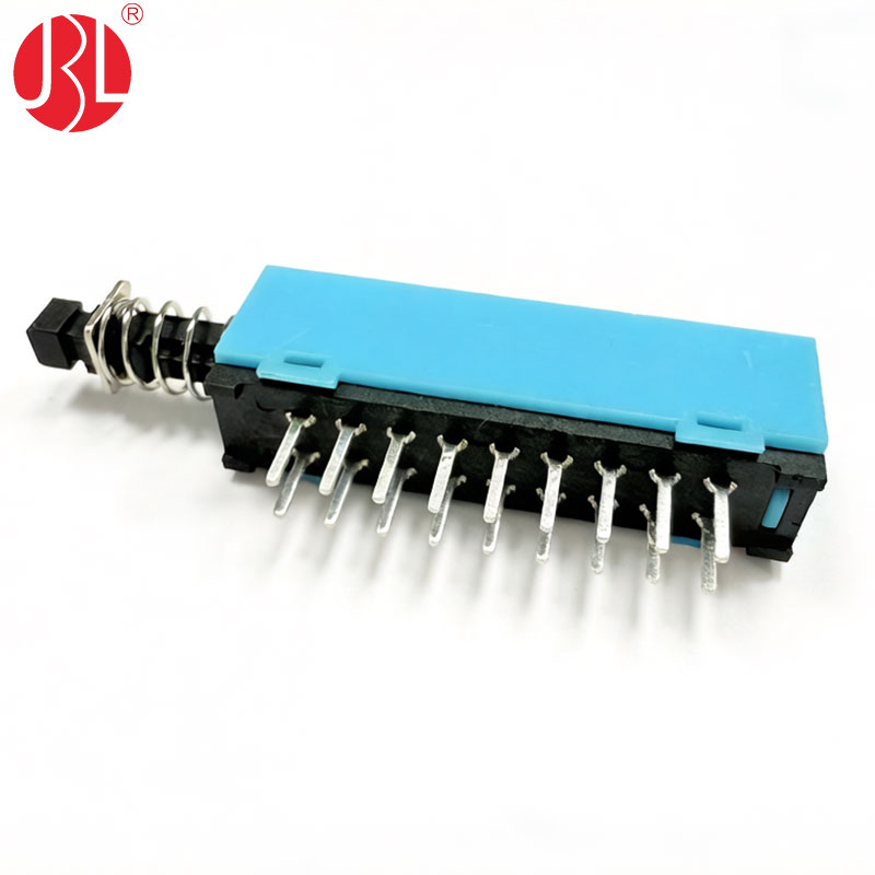 The 6P2T Push Button Switch (also known as 6PDT or 6-Pole Double-Throw) is a high-density, multi-circuit electromechanical switch ideal for applications demanding simultaneous control of up to six independent circuits across two positions. Equipped with 18 pins in a through-hole right-angle configuration, it mounts perpendicular to the PCB, minimizing footprint in compact assemblies while ensuring secure mechanical attachment and reliable soldering.