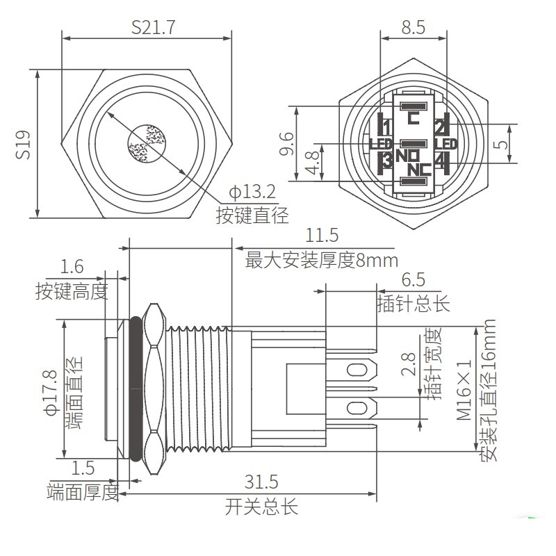 11.Função: Momentray ON-OFF/OFF-(ON) 12. Temperatura de operação:-20°C~+85°C 13.Grau de proteção:IP65
