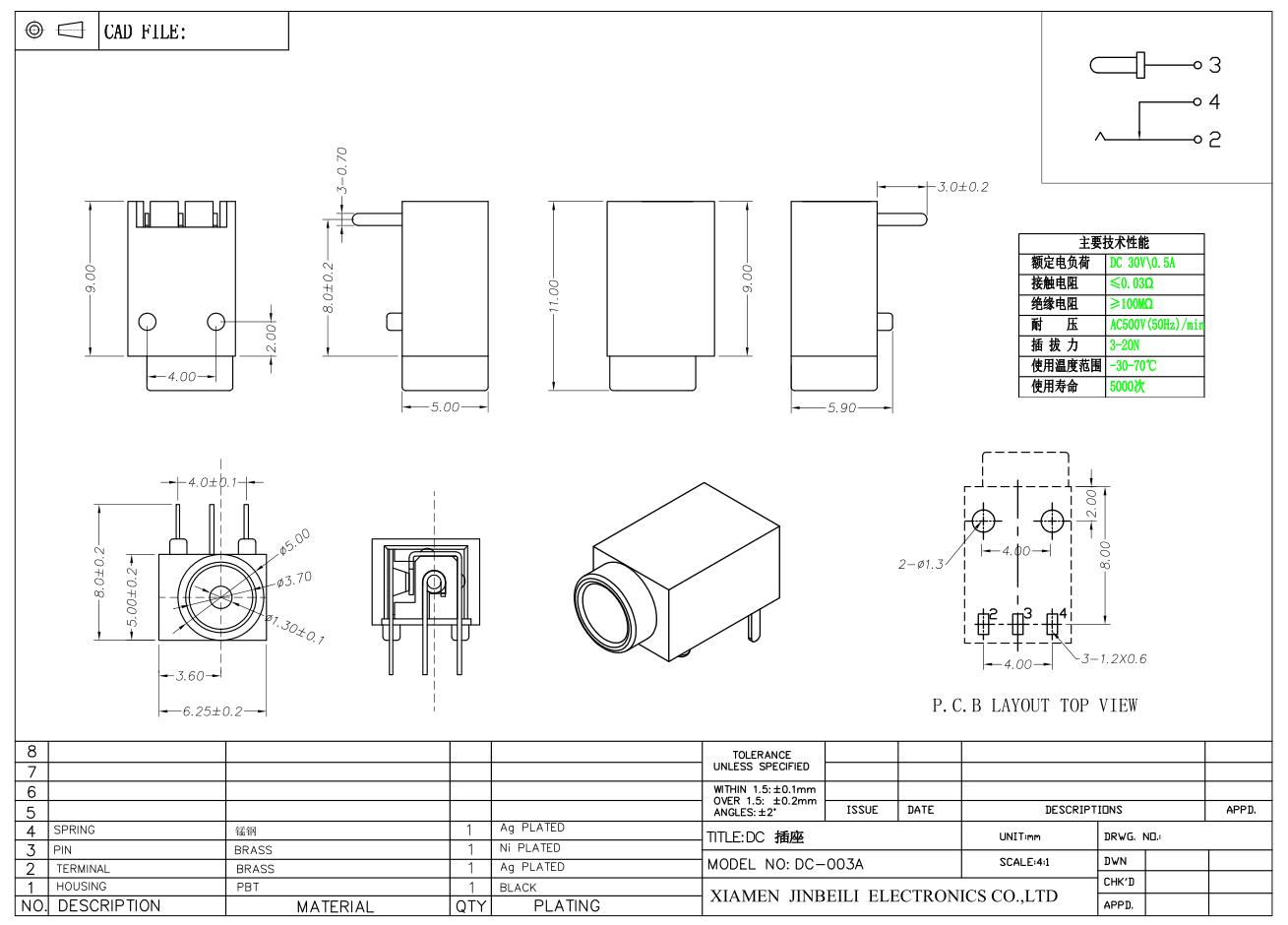 DC-003A DC Jack 1,0mm 1,3mm Conector de alimentação DC24V 2A 3,5A PJ-040CH