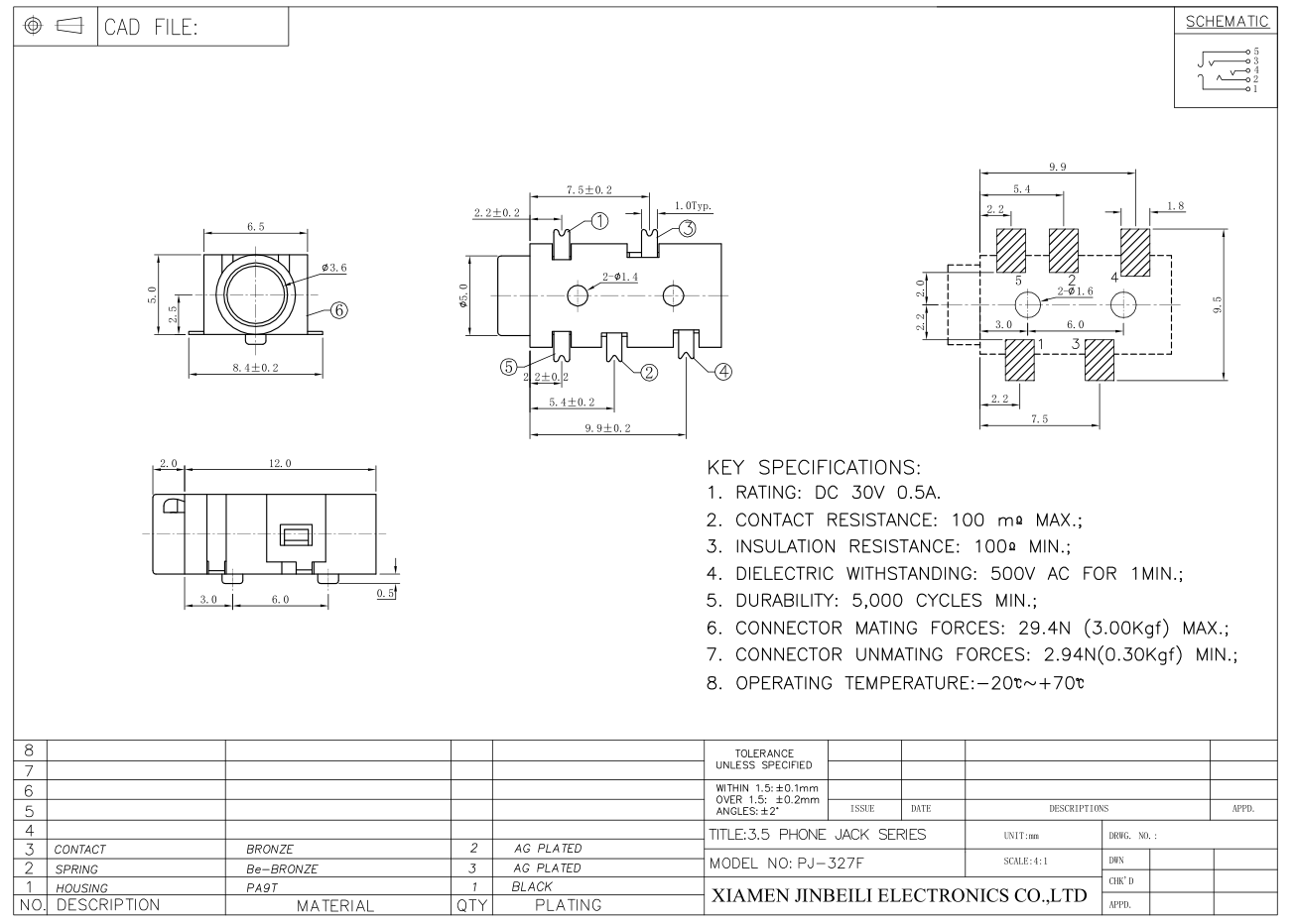 PJ-327F Conector de áudio de 3,5 mm SMD DC12V 1A Conector estéreo para walkie-talkie de rádio bidirecional