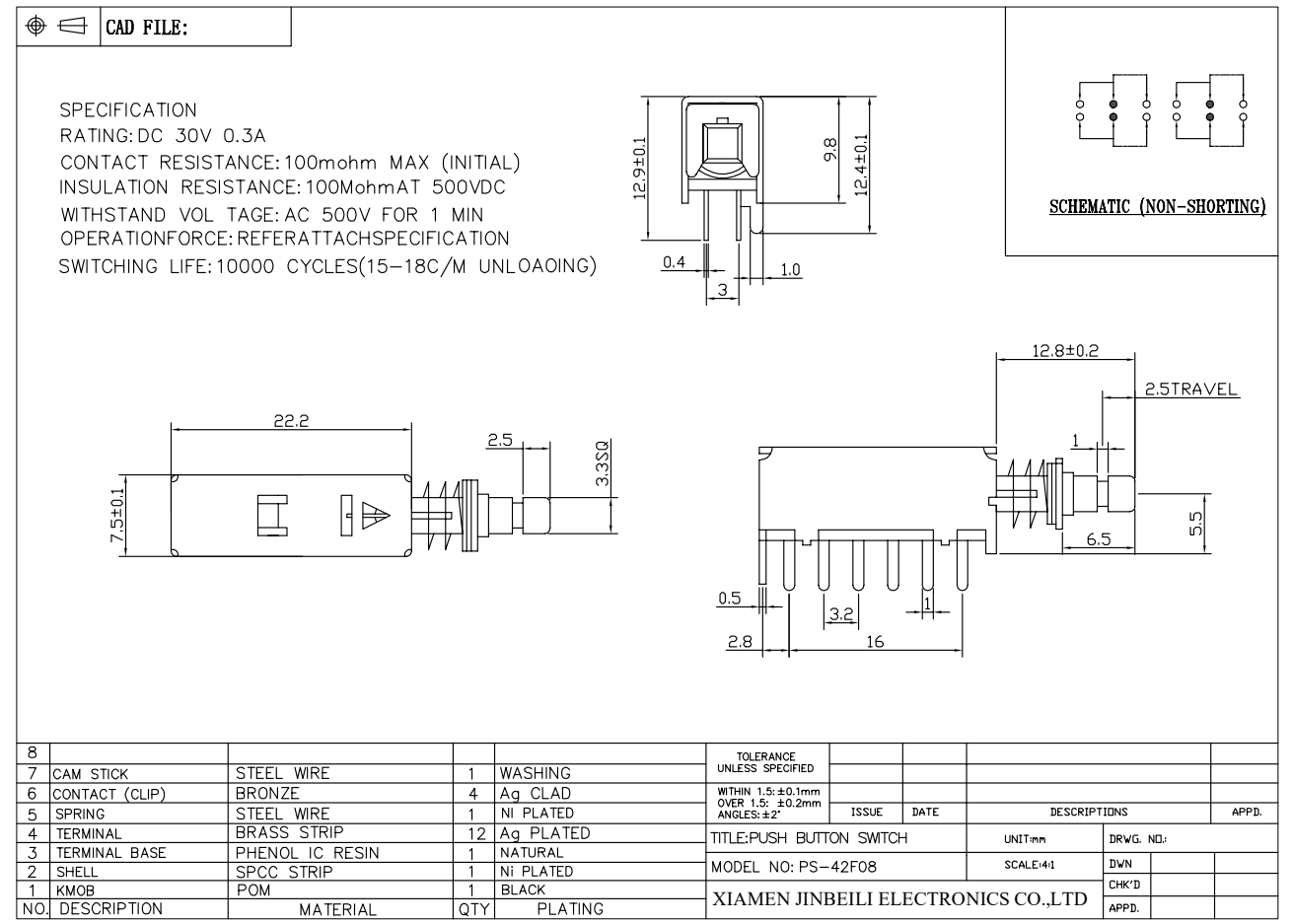 Interruptor de botão PS-42F08 4PDT através do orifício em ângulo reto