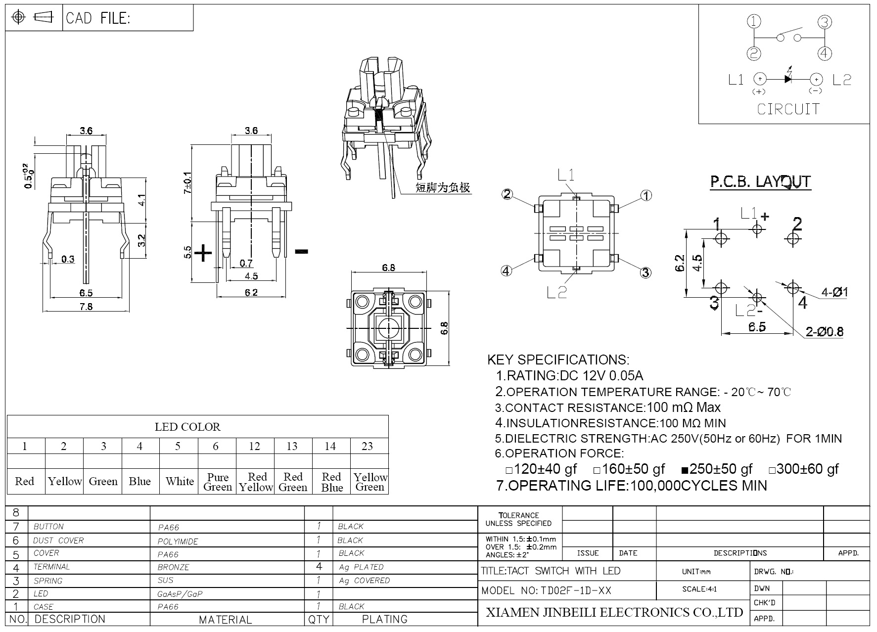Opções de força operacional: □120±40 gf □160±50 gf ■250±50 gf □300±60 gf Personalização disponível