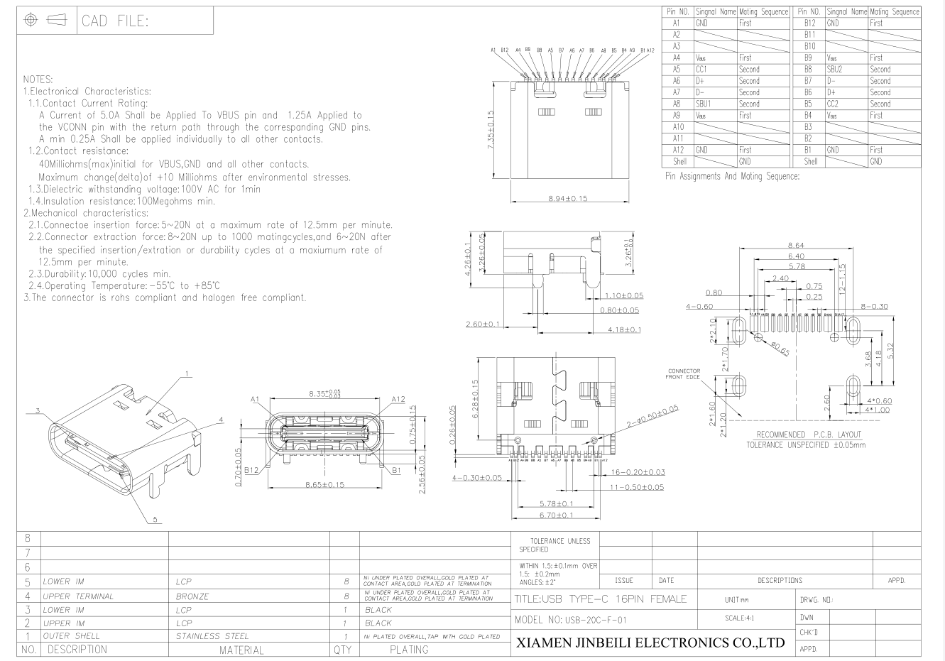 USB-20C-F-01 Receptáculo USB 2.0 Tipo C 16 pinos montagem em superfície através do orifício USB 2.0 tipo C