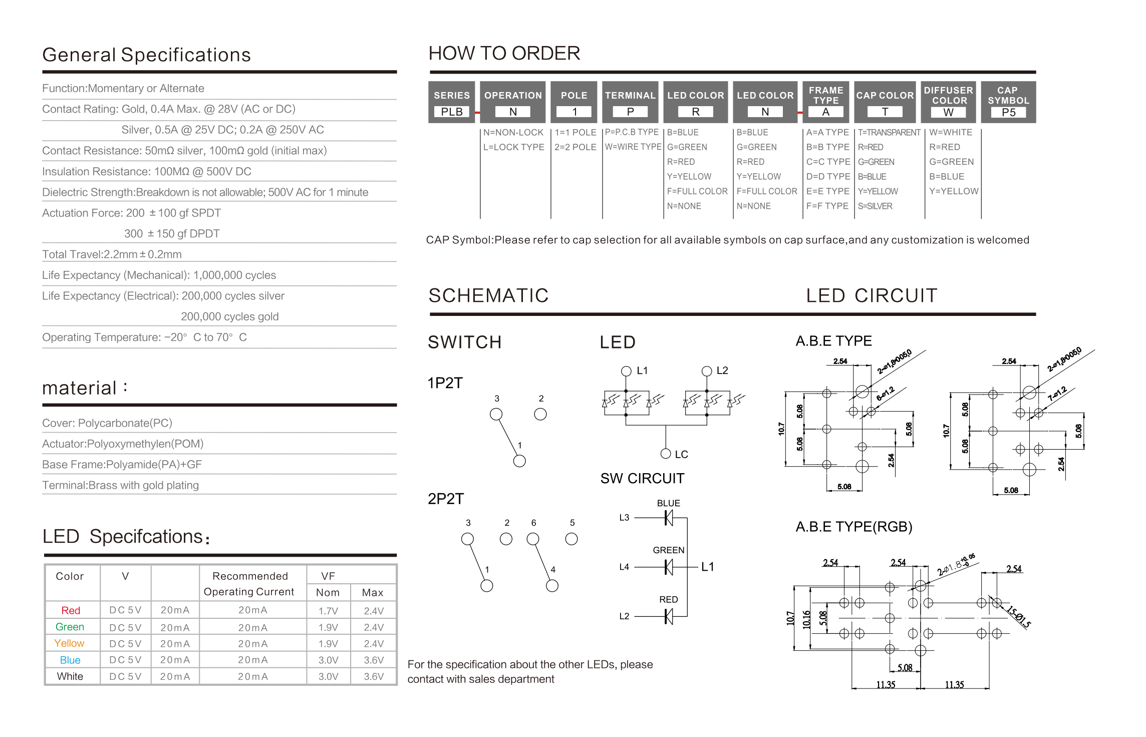 1. Номинальные параметры переключателя: 25 В постоянного тока, 0,5 А. 2. Ход: 2,2 мм ± 0,2 мм 3. Время: без короткого замыкания 4. Контактное сопротивление: 50 мОм макс. 5. Сопротивление изоляции: 100 МОм мин. 6. Диэлектрическая прочность: 250 В переменного тока в течение 1 мин. 7. Рабочая сила: ■200±100 гс □300±100 гс 8. Срок службы: 1 000 000 циклов. 9. Испытание соляным туманом: NSS 48H (может быть настроено в соответствии с требованиями заказчика) 10. Диапазон рабочих температур: от -20 ° C до + 70 ° C 11. Применение: бытовая техника, электроника, промышленность, аудио / видео продукты