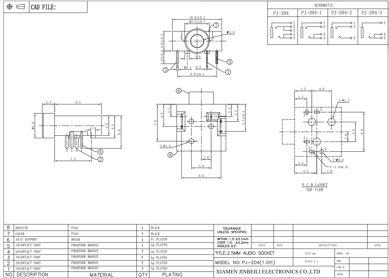 PJ-204B Аудиоразъем 2,5 мм DIP 5Pin DC12V 1A Прямоугольный стереоразъем