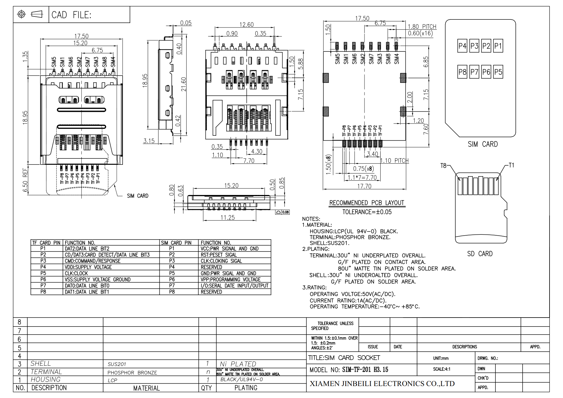 SIM-TF-201 H3.15 Dual SIM Card 8Pin & TF Card 8Pin Socket