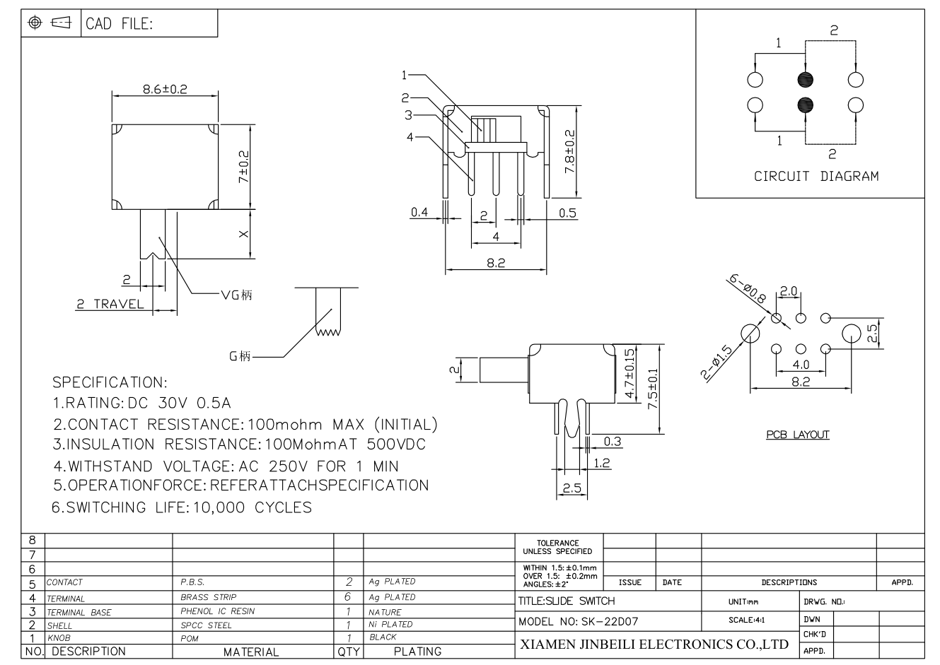 SK-22D07 Slide Switch DPDT DIP Through Hole Right Angle PC Pin