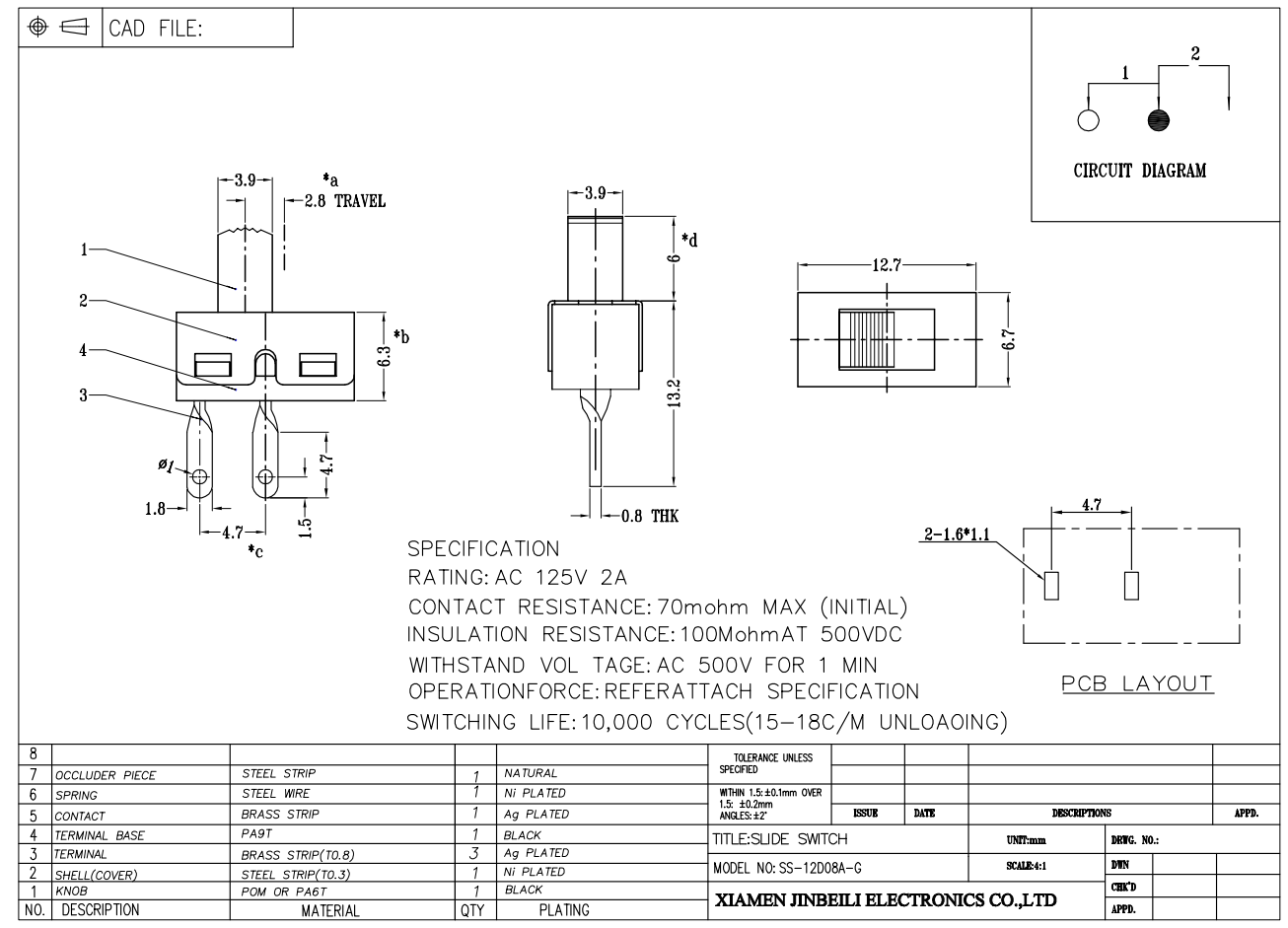 SS-12D08A SPDT Slide Switch DIP Through Hole Vertical Solder Lug