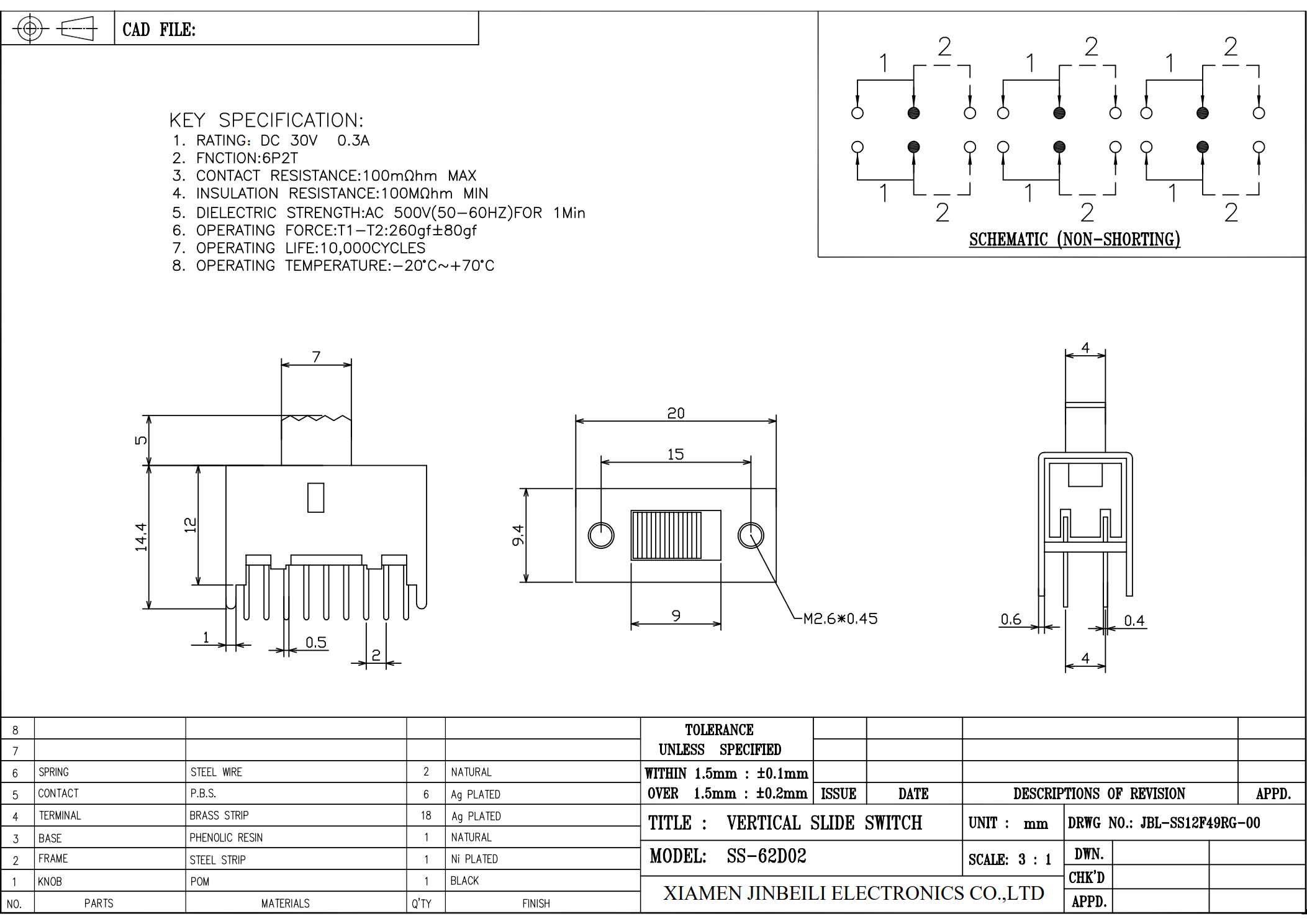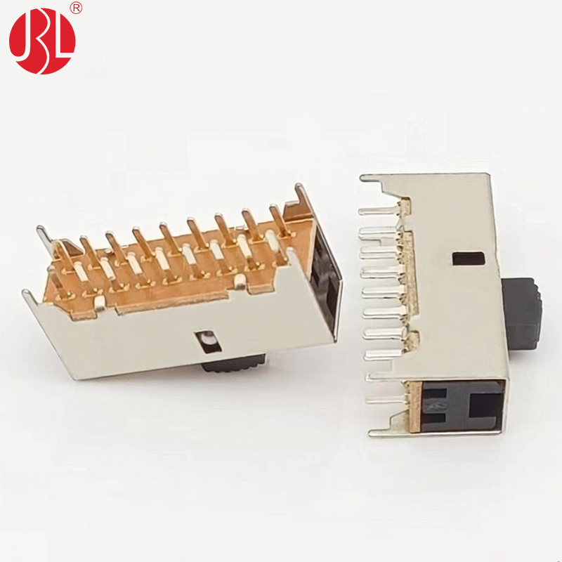 This component is a 6P2T vertical slide switch, a robust and versatile solution for complex circuit routing. The “6P2T” designation indicates it has six independent poles (circuits) controlled by a single actuator, each capable of switching between two distinct positions (Two-Throw). This allows it to simultaneously control multiple signal paths, making it ideal for applications like mode selection, data routing, or channel switching in audio and communication equipment.