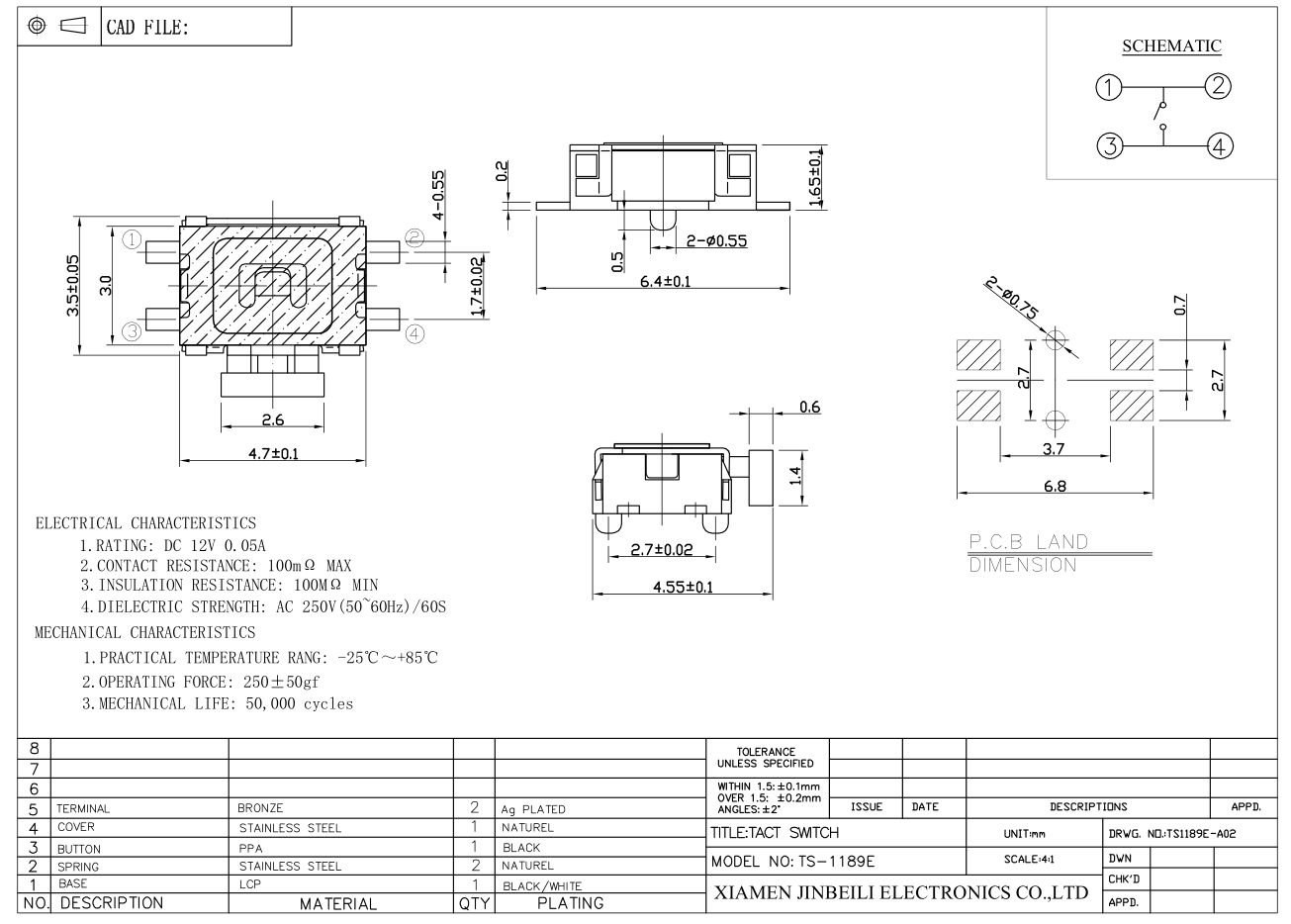 The tactile switch measures 6.4×3.5mm in outline ( also called 4.7*3.5mm ) and is designed for surface mount technology (SMT) applications, providing a reliable and compact solution for various electronic devices. This switch features a board edge mount design, making it easy to integrate into printed circuit boards (PCBs). It offers a tactile feedback when pressed, ensuring users can confidently confirm their input.