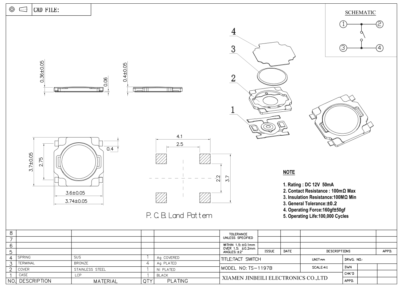 TS-1197B 3.7*3.7mm Low Profile Dome Tactile Switch SMD
