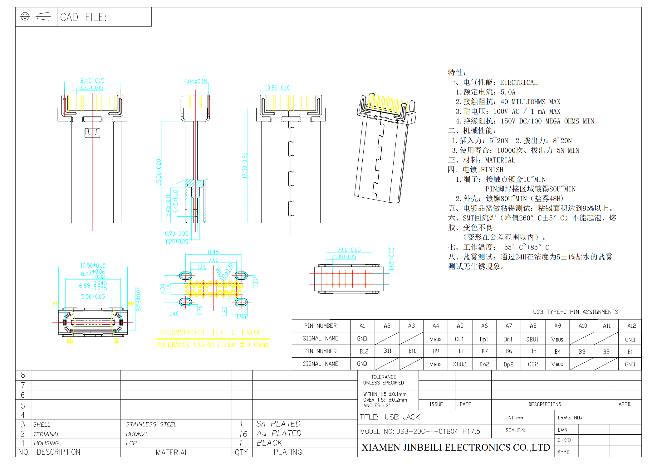 USB-20C-F-01B04 H17.5 USB Type C Socket 16pin Through Hole