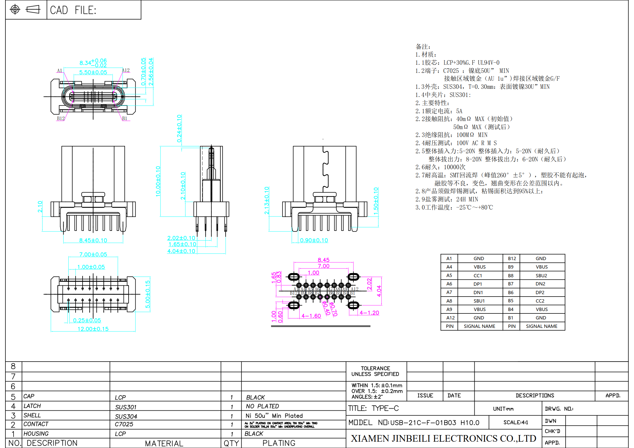 USB-21C-F-01B03 H10.0 USB Type C Jack 16pin Through Hole