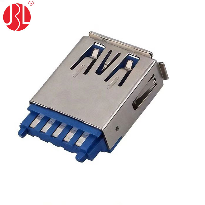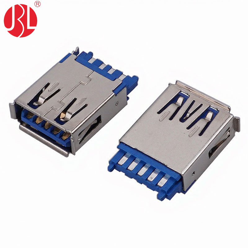 This component is a USB 3.0 Standard-A female socket, designed for in-line cable integration or panel mounting. Its defining feature is the classic, rectangular USB-A port shape, internally upgraded with nine electrical contacts to support SuperSpeed USB 3.0 data transfers. These contacts consist of the traditional four pins for USB 2.0 compatibility (power, ground, and differential data pair D+/D-) and five additional pins dedicated to the separate SuperSpeed transmit and receive lanes, enabling significantly higher bandwidth.