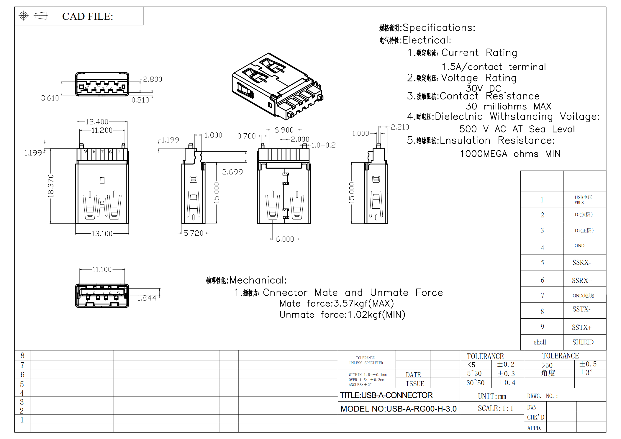 USB-A-RG00-H-3.0 Cable Mount USB Type A 3.0 Jack Free Hanging