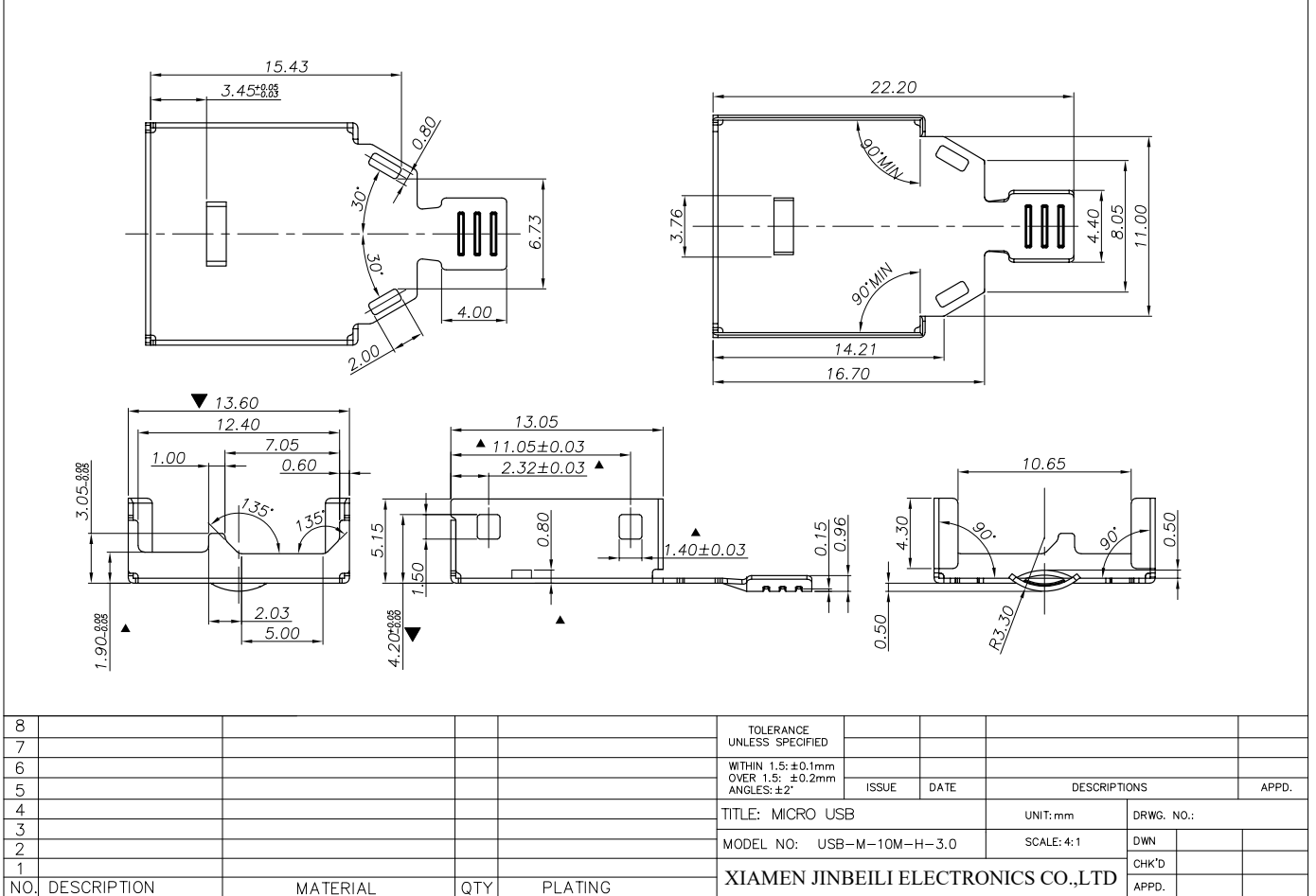 USB-M-10M-H-3.0 Free Hanging USB 3.0 Micro B Receptacle 10 Positions