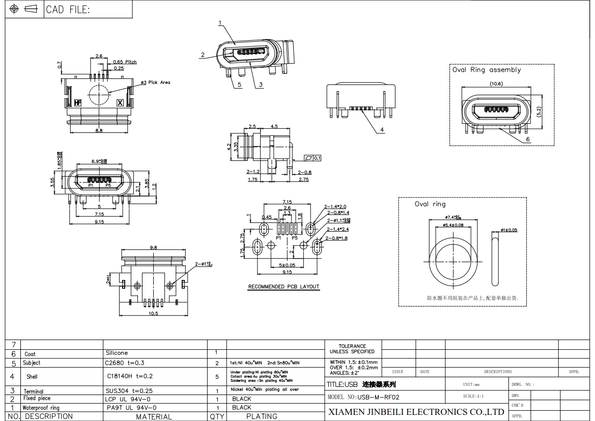 USB-M-RF02 Waterproof Micro USB Jack SMT Right Angle